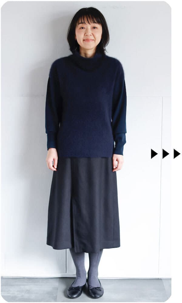 Y様のクローゼットの中に一番多い色、安心感あるネイビーで、新鮮なサイズ感のニットにチャレンジです。印象を明るくしてくれるアイボリーのスカートを合わせ、フェミニンさあるオフィスカジュアルなスタイルに。足元にはローファーを合わせ、甘さを調整し完成です。