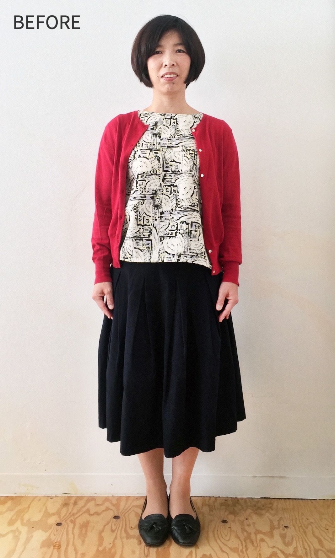 植村さんにお願いする前は、小花柄やボーダー、ぱっと目をひく色のアイテムを選ぶことが多く、服は増えたものの最近はどれも似合わないような気がして、コーディネートに悩んだり着こなしに自信がなくなって毎朝憂鬱でした。